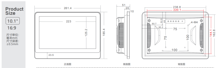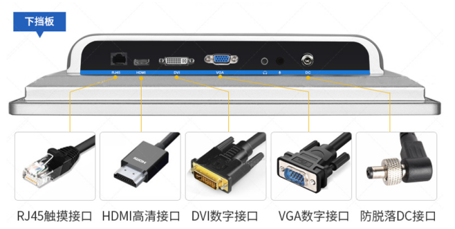 FY-XS1101 10.1寸四代工业显示器采用铝合金材质,VGA、DVI、HDMI触摸接口,前面板IP65防尘防水,适合-10℃~60℃工作环境。