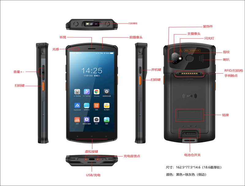 FY-8650 5G智能手持终端PDA,搭载新一代原生Android 12系统,5G全网通;依托高性能天玑900 5G旗舰平台,主频2.4Ghz,A78大核CPU,处理速度较同行产品骁龙690平台快了将近一倍;内置4000mAh长续航电池,支持可拆卸,运用PE+快充技术,充电速度更快,可满足即时需求;搭载专业高速二维扫码引擎,扫码速度达到了毫秒级,内置高性能CPU,针对易脏污、磨损条码等均可高效快速轻松精准识别采集;还可配扫码手柄、RFID手柄,实现18M读码距离,提高工作效率。
